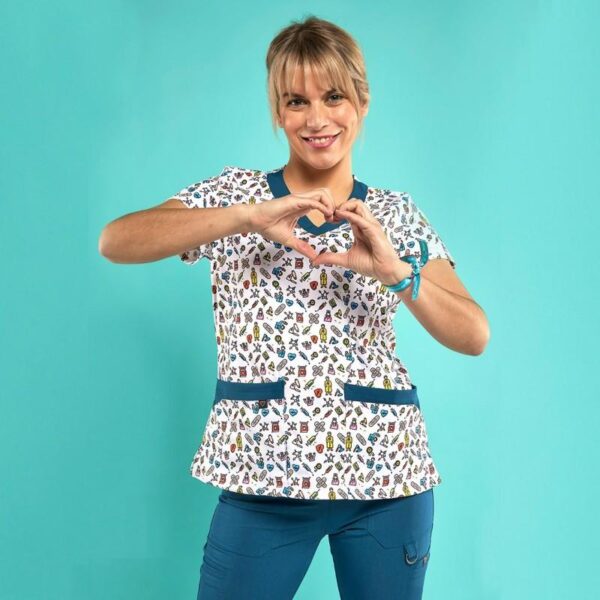 Estampada con tres originales y divertidos diseños de KUKUXUMUSU, se convierte en una prenda ideal para uniformes de enfermería, doctores, pediatras y demás profesionales sanitarios en hospitales, clínicas y centros médicos, farmacia, laboratorio, veterinario o comercio.