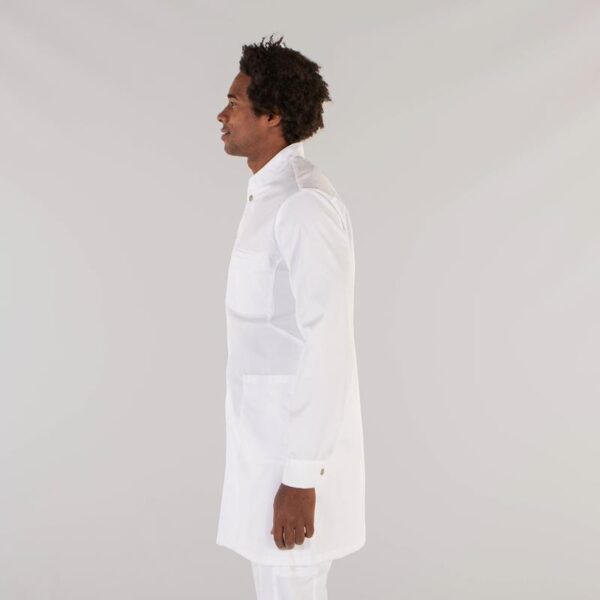 Bata para hombre en manga larga, con cuello mao, cierre mediante botones de presión ocultos, un bolsillo en pecho izquierdo, dos bolsillos delanteros, uno de ellos doble y puños con corchetes vistos. Prenda holgada, con fuelle en la espalda.