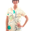 Casaca unisex en manga corta, cerrada, con cuello de pico, un bolsillo en el pecho izquierdo y dos bolsillos de parche delanteros. Prenda holgada, con aberturas laterales.