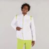 Casaca para hombre en manga corta, con cuello pico y dos bolsillos laterales. Prenda holgada con costadillos en delantero y espalda.