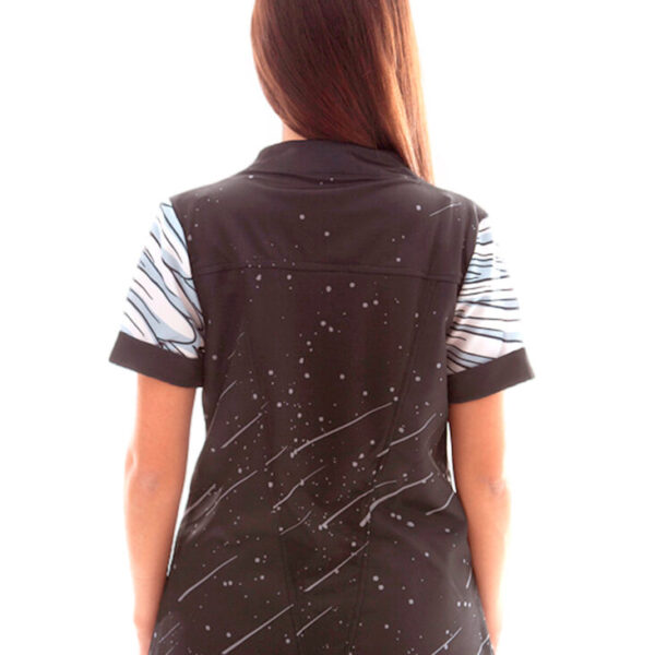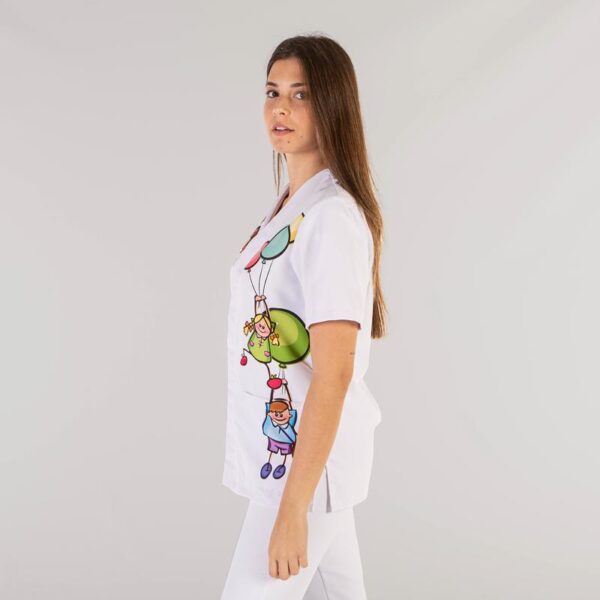 Casaca unisex en manga corta, con cuello pico, cierre mediante botones de presión ocultos y dos bolsillos de parche delanteros. Prenda holgada, con aberturas laterales. Disponible en color blanco estampada con dos originales y divertidos diseños de niños con globos o perros.