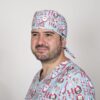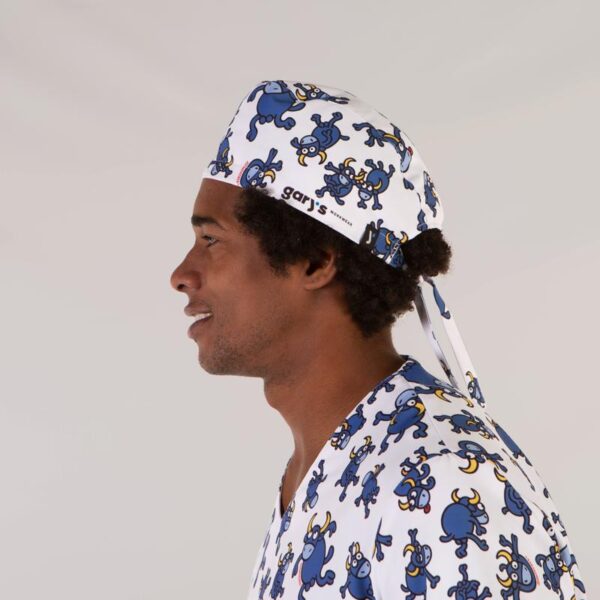 Gorro unisex sanitario, confeccionado en MICROFIBRA de 100% Poliéster, estampado con diseño solidario para colaborar en la lucha contra el cáncer. Prenda en talla única, que cuenta con tiras de ajuste traseras para anudar y franja interior de rizo en el frontal para combatir la sudoración.