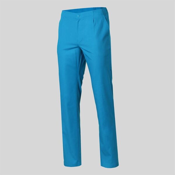 Pantalón unisex regular fit, con media goma en cintura trasera, cremallera y botón, trabillas y dos bolsillos franceses en cadera.
