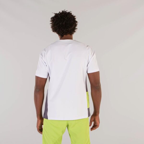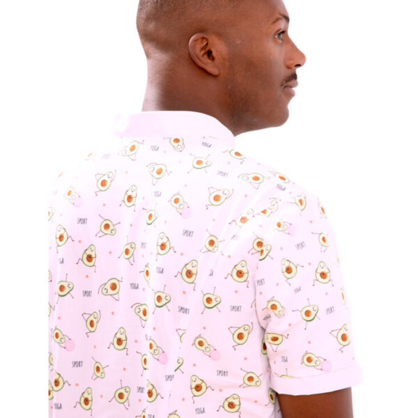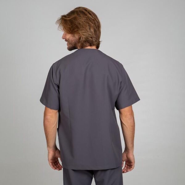 Casaca para hombre en manga corta, con cierre cruzado mediante botones de presión ocultos y dos bolsillos de parche delanteros. Prenda semi ajustada, con pinzas en la espalda.
